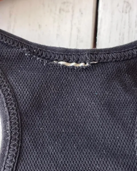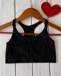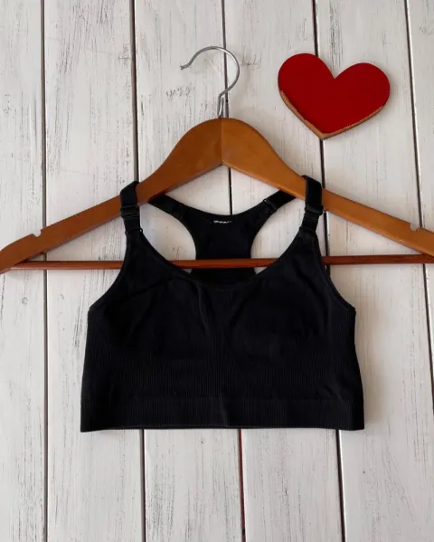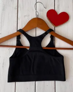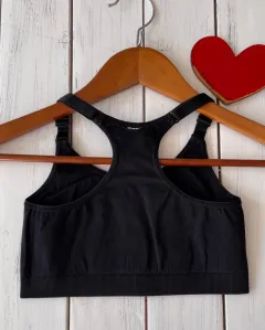 Top negro. Talla: XS Se le quitó la etiqueta y se descosió un poco, no afecta su uso.No trae copas integradas y tampoco trae espacio para ponerle.Medidas: 26 cm axila y 28 cm bajo el busto.