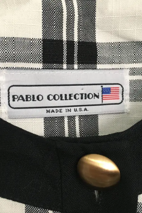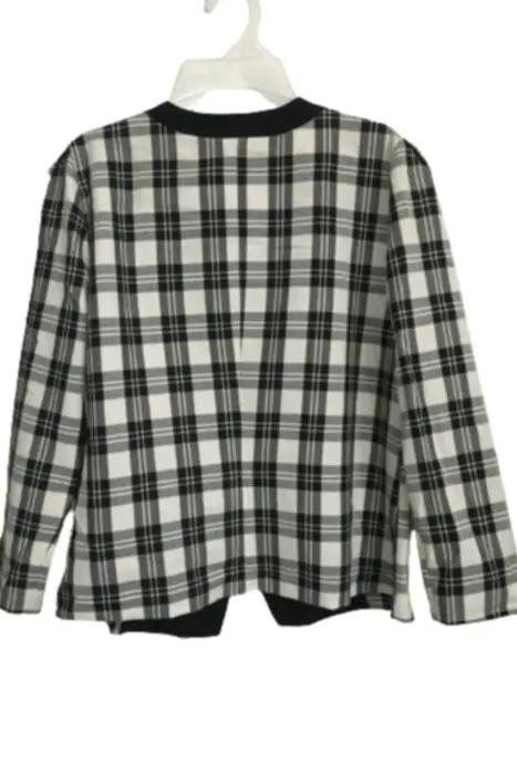 Blazer a cuadros color blanco y negro con botones dorados, estilo vintage. Tela delgada tipo chifón. Talla L, marca Pablo Collection.