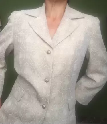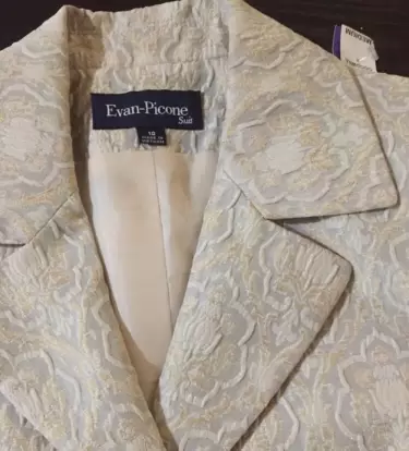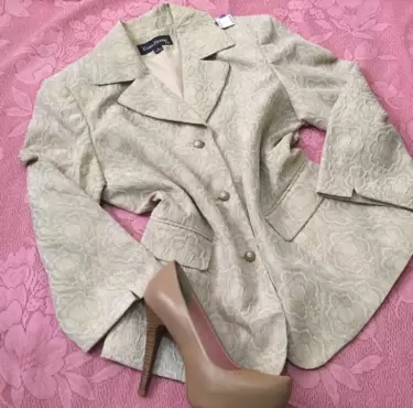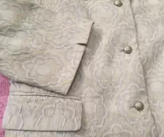 Blazer aperlado impecable. Hermoso blazer formal con destellos y adornos dorados, es nuevo, el color de fondo es aperlado, es una prenda perfecta, botones metálicos y en forma de flor, es Talla G/L, medidas; hombro 39 cms, axila 50 cms, largo 63 cms, manga tres cuartos, es impecable