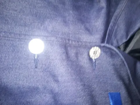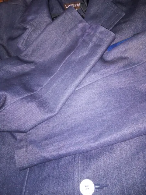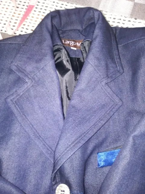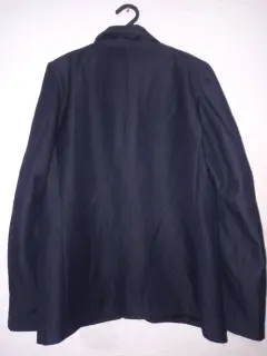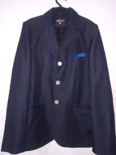 Blazer azul marino con vivos de azul más claro en las tres bolsas al frente y los costados, tiene 3 botones plateados con forro. De axila a axila 100 cm y de largo 70 cm