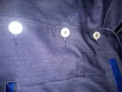 Blazer azul marino botones plateados. Blazer azul marino con vivos de azul más claro en las tres bolsas al frente y los costados, tiene 3 botones plateados con forro. De axila a axila 100 cm y de largo 70 cm