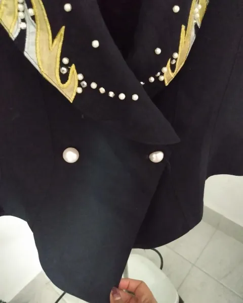 Blazer azul marino con detalles dorados. Blazer azul marino muy obscuro casi negro , no tiene talla sin embargo queda a talla S , super bonito