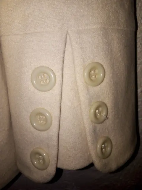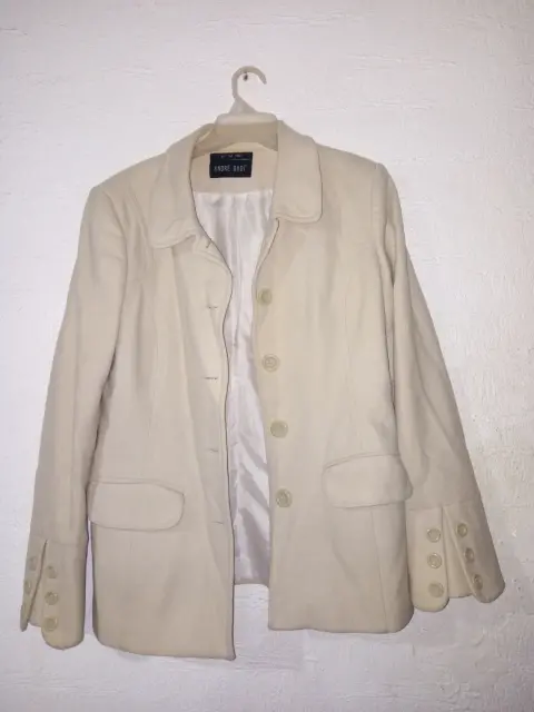 Blazer color beige con adornos de 6 botones en cada puño, al frente 5 botones y dos bolsas de cartera. Cuenta con forro mismo color. Mide de axila a axila 100 cm, largo 67 cm. Requiere tintorería.