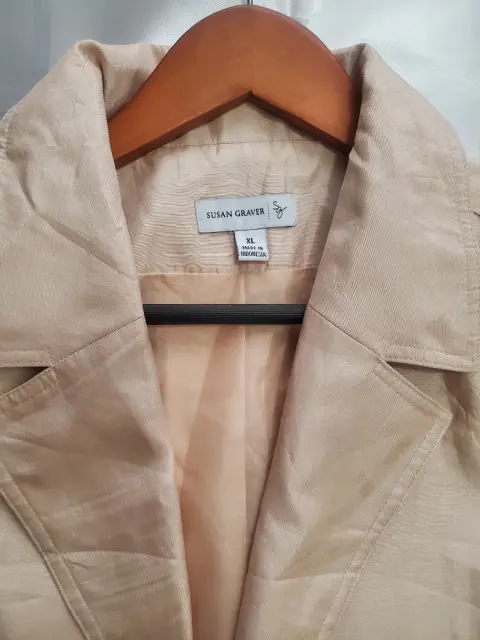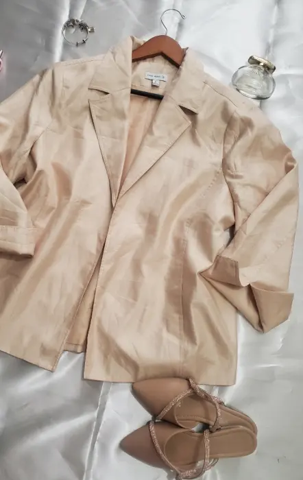 Blazer beige de cuello y solapa. Blazer casual .tela satinada, manga larga, puños abiertos y solo broche para cerrar
