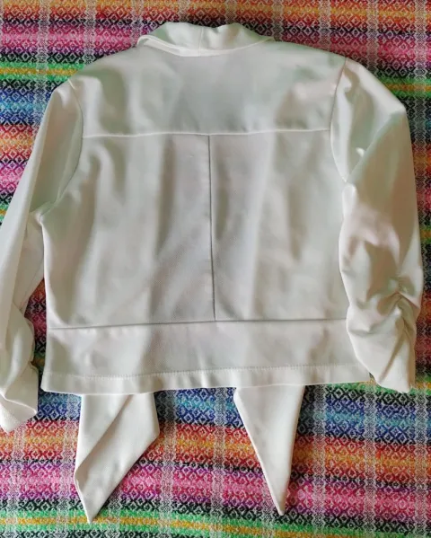 Hermoso blazer talla M, para uso casual, en color blanco con manga 3/4, sin botones.Esta en excelente estado, solo tiene un pequeño detalle de uso (mostrado en la foto). Cualquier duda, pregúntame con confianza. (Los accesorios en la foto, no van incluidos).