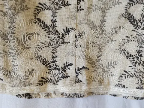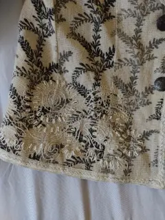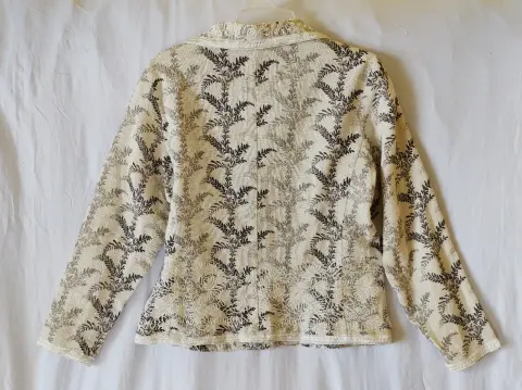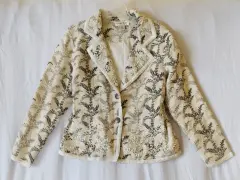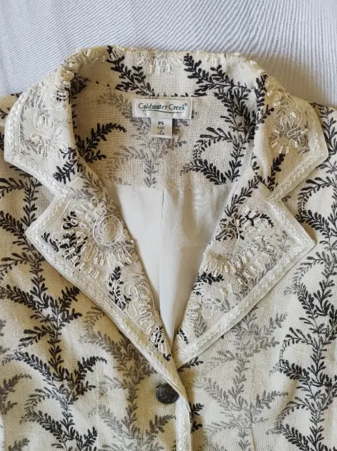 Blazer bordado COLDWATER CREEK. Bello blazer elaborado en algodón con textura de lino (muy fresco), con forro, muy ligero, el color es crudo natural, cercano a la primera imagen, estampado de hojas y bordado, en las orillas tiene aplicación bordada, como último detalle piedras blancas en la parte delantera. Dice talla SP, si eres talla 7 también te queda, que está entre la S y la M.