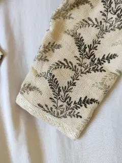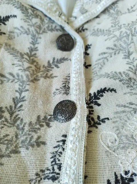 Bello blazer elaborado en algodón con textura de lino (muy fresco), con forro, muy ligero, el color es crudo natural, cercano a la primera imagen, estampado de hojas y bordado, en las orillas tiene aplicación bordada, como último detalle piedras blancas en la parte delantera. Dice talla SP, si eres talla 7 también te queda, que está entre la S y la M.