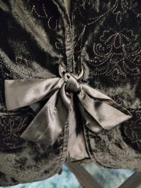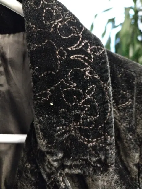 Blazer bordado de Terciopelo. Blazer tipo saco color negro bordado mismo tono se cierra con listón talla XS. Marca Old Navy New York. En perfecto Estado