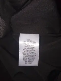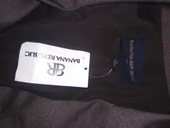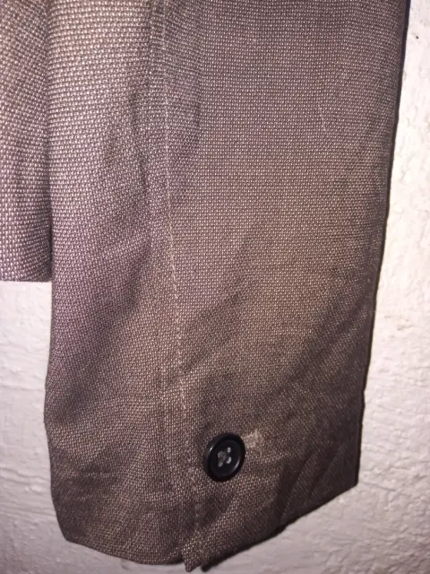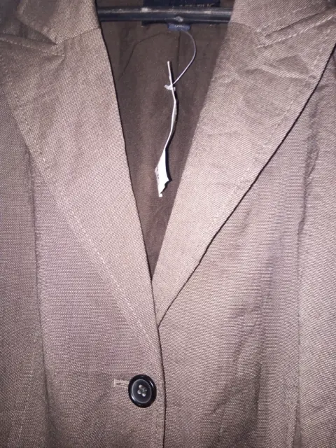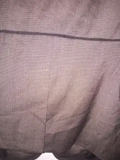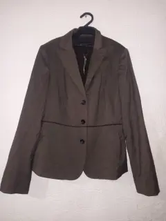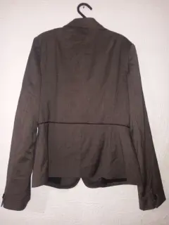 Blazer café con cinta negra con 5 botones, 3 al frente y uno en cada manga, de axila a axila 100 cm y de largo 62 cm.