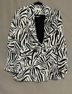 Blazer con estampado de zebra. El blazer tiene una mancha en la espalda, se puede ver en la última foto. Se llevó a tintorería pero no se le pudo quitar. Hombro 45 cm, axila a axila 53 cm, manga 62 cm, largo 77 cm
