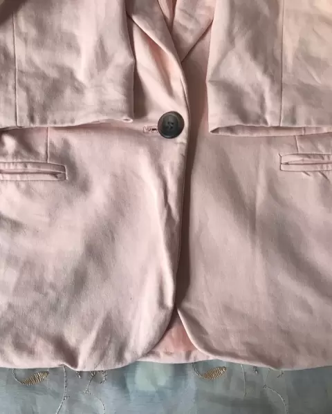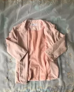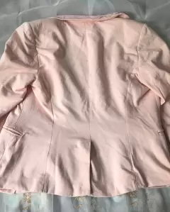 Blazer color durazno, con botón al frente, bolsillos delanteros, con hombreras, manga 3/4, tiene ligero desgaste en el cuello (ultima foto), marcado como S, 48cm axila axila, 45cm hombro hombro, 58cm largo. 40xm largo mangas