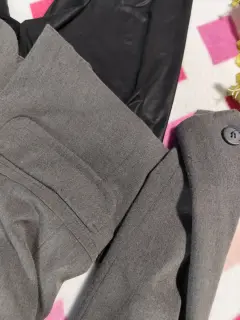 Blazer corto, gris rata. 2 botones al frente, 2 bolsillos. Ligero stretch, amolda al cuerpo (tiene un corte en la cintura que ayuda con la silueta. Talla 11-13.