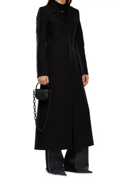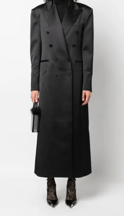 Blazer largo, europeo elegante de doble botonadura tipo judío para mujer,talla grande, con cintura ligeramente entallada a base de dos botones en la parte trasera para una silueta definida, es de razo , negro forro poliéster.Medidas: de axila a axila 52 cm, de hombro a axila 23 cm largo 102 cmPor alguna razón sus bolsillos están cocidos al menosA mi no afectaba su estética ni funcionamiento.