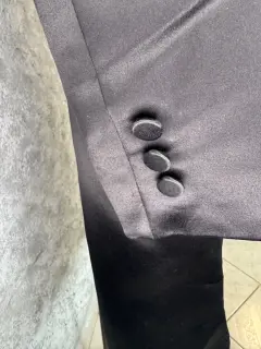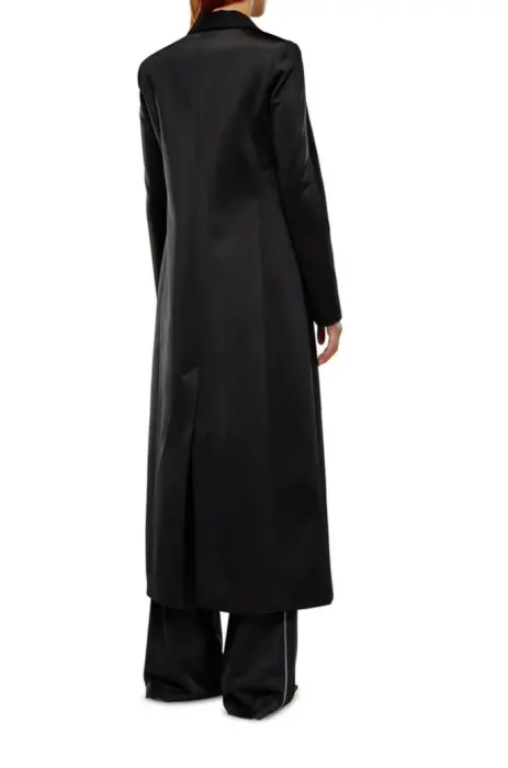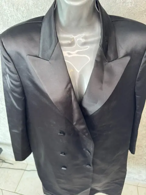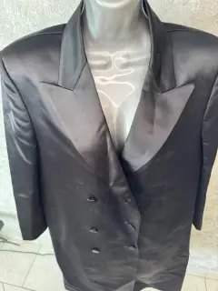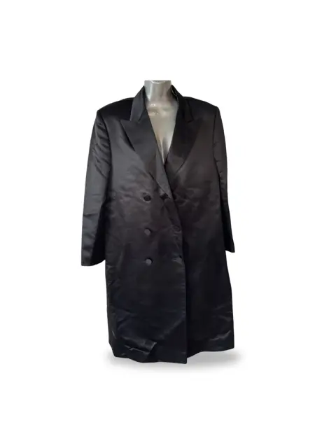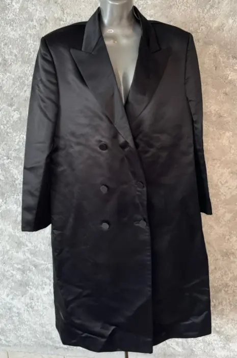 Blazer largo europeo elegante de razo.. Blazer largo, europeo elegante de doble botonadura tipo judío para mujer,talla grande, con cintura ligeramente entallada a base de dos botones en la parte trasera para una silueta definida, es de razo , negro forro poliéster.Medidas: de axila a axila 52 cm, de hombro a axila 23 cm largo 102 cmPor alguna razón sus bolsillos están cocidos al menosA mi no afectaba su estética ni funcionamiento.
