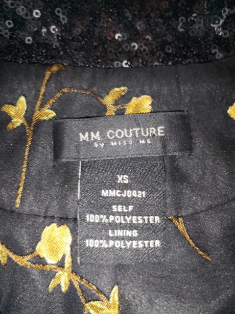 Saco tipo blazer, broche con botón de lentejuela pequeña. Talla XS. Color negro, marca MM COUTURE. Nuevo sin etiqueta