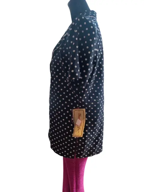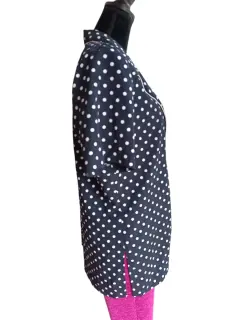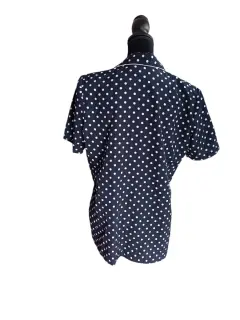 BLAZER MANGA CORTA AZUL MARINO CON LUNARES BLANCOS, SIN BOTONES,TALLA L/XL, MIDE DE HOMBRO A HOMBRO 44.5 CM, DE AXILA A AXILA 57.5 CM,LARGO 72 CM