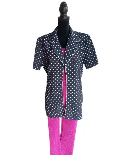 BLAZER MANGA CORTA TALLA L/XL. BLAZER MANGA CORTA AZUL MARINO CON LUNARES BLANCOS, SIN BOTONES,TALLA L/XL, MIDE DE HOMBRO A HOMBRO 44.5 CM, DE AXILA A AXILA 57.5 CM,LARGO 72 CM