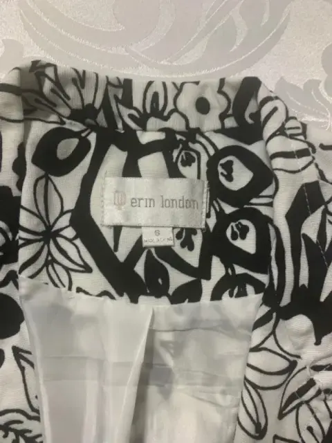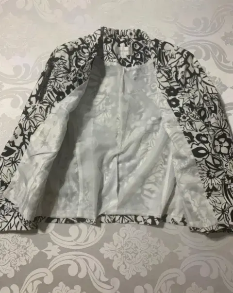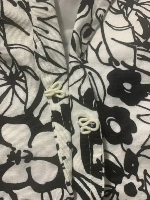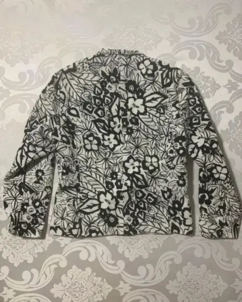 Blazer moderno, forrado y con pequeñas hombreras, delgada solapa, tela estampada de algodón.Medidas/ espalda: 38 cm, busto: 44 cm, cintura: 43 cm, largo: 55 cm.