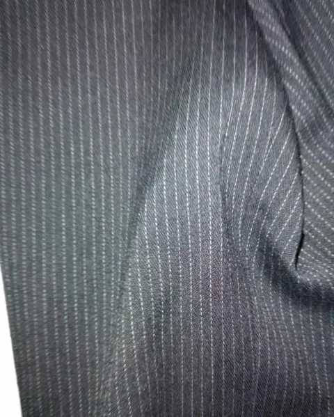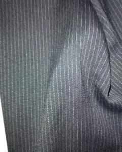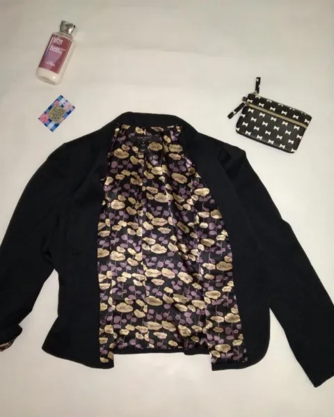 Bonito blazer color negro con rayitas blancas, llega a la cintura ,con un forro en color dorado y morado ,cero detalles