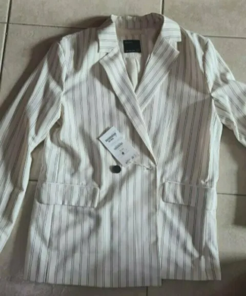BLAZER NUEVO CON ETIQUETA BERSHKA. Completamente nuevo con etiqueta de 799 pesos, color hueso con líneas negras, talla M...elevado tu oufit.