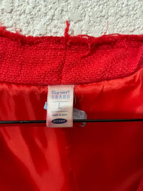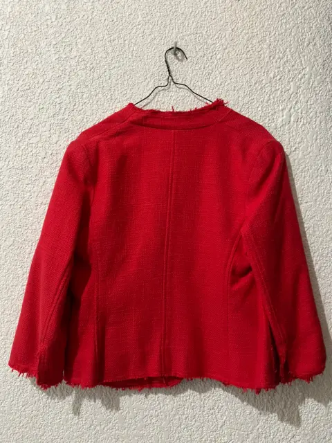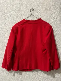 Lindo blazer color rojo, viene con pequeños y discretos broches para poder cerrarse.Tiene un detalle en la parte del hombro que está marcado en la primera y ultima foto.