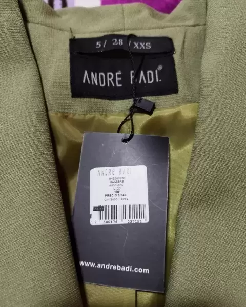 Blazer verde Olivo André Badi. Blazer nuevo, bonito corte y tela con textura. Esta muy padre el corte, a mí no me luce por qué soy chaparrita (mido 1.49). Es completamente nuevo, nunca lo use. Fiel a su talla, puede quedar a una talla 30 si no eres de espalda ancha, yo soy talla 28 o 30 depende del corte del producto.