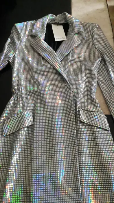 Blazer Vestido tipo lentejuelas. Nuevo hermoso blazer vestido Bershka, talla S 26, mide 45 axila 40 hombro 80 largo, resorte en cintura, tiene tela strech, se puede usar como blazer largo abierto , tiene botones, muy elegante, envio en caja reciclada