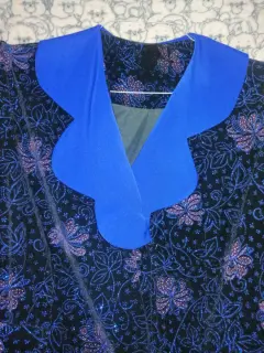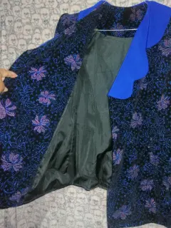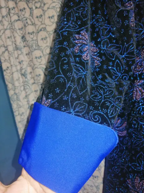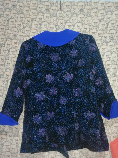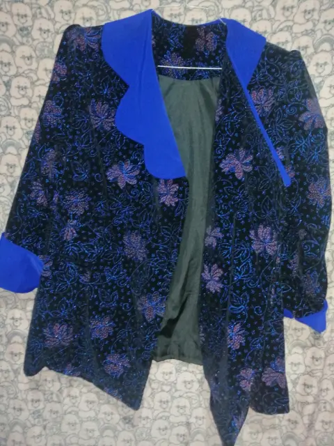 Hermoso blazer de terciopelo Vintage, elegante, sofisticado, con detalles brillantes y flores. Acabado en mangas y cuello azul intenso, talla grande, forro interior, cuenta con 3 broches para cerrarlo al frente. Precioso