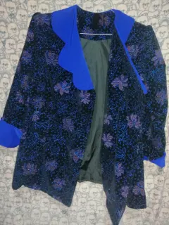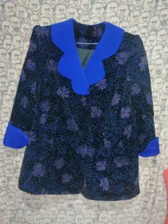 Blazer Vintage. Hermoso blazer de terciopelo Vintage, elegante, sofisticado, con detalles brillantes y flores. Acabado en mangas y cuello azul intenso, talla grande, forro interior, cuenta con 3 broches para cerrarlo al frente. Precioso
