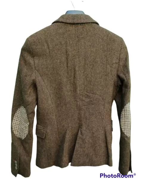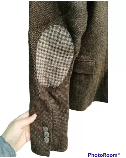 Hermoso blazer café de estilo vintage, tiene parches en los codos dándole un toque diferente, tiene forro de tela suave y es muy cómodo. Tiene todos sus botones y no tiene detalles
