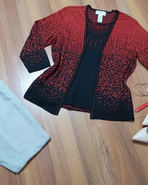 Sueter con blusa y detalle de pedrería en el frente. Sueter pegado a la blusa, simula ser un blazer con su blusa, color rojo con negro. Con esta prenda en poco tiempo ya estarás lista para salir 😉
