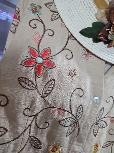 Saco elegante y fresco, flores bordadas en colores azul, amarillo, rojo, azul. Manda tres cuartos, botones delicados. Combinable en extremo