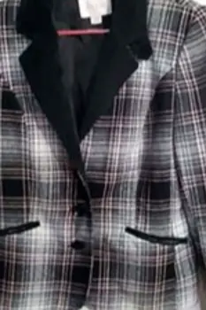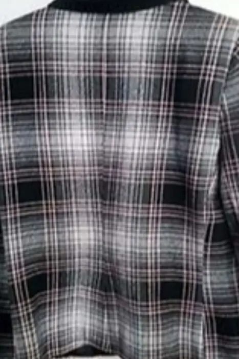 Saco grueso con forro, tela de cuadros, con solapa negra en contraste, bolsillos simulados, el fondo es blanco con rosa muy tenue, marca AlexisEnvío a la brevedadacepto ofertas