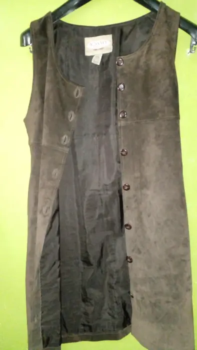 Chaleco de mujer color café, piel gamuza, usado en buen estado, marca oOLD NAVY, talla XS