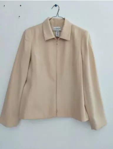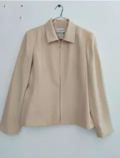 Chaqueta beige con cierre. Se usó muy poco y está en muy buen estado. Talla L, con cierre frontal. Luce muy padre con Jeans. No tiene strech, se acomoda perfecto para lucirlo formal, cerrado o abierto.