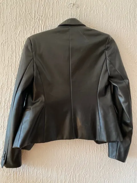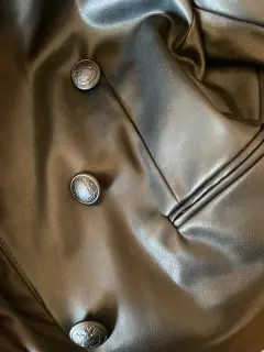 Blazer corto tipo vinipiel, Marca Express, Color negro Talla XS, manga larga con bolsas laterales, tiene unos hermosos botones gravados Sin etiqueta tiene un pequeño defecto por estar guardado