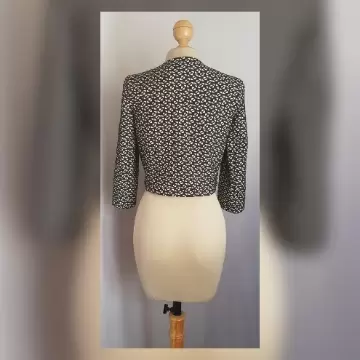 Chaqueta cropped c/estampado bitono BLANCO LINO/NEGRO ÉBANO, cuello clásico c/solapas, sin sistema de cierre, manga 3/4, 2 bolsos simulados vivo c/tapeta y forro interior. Talla M. Dimensiones cms: 39 hombro, 52 axila, 53 zona baja, 51 largo, 45 manga. 58% poliéster, 39% algodón, 3% elastano. Para lavado en casa.***HECHO EN ITALIA***