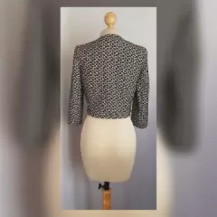 Chaqueta Cropped Estampado. Chaqueta cropped c/estampado bitono BLANCO LINO/NEGRO ÉBANO, cuello clásico c/solapas, sin sistema de cierre, manga 3/4, 2 bolsos simulados vivo c/tapeta y forro interior. Talla M. Dimensiones cms: 39 hombro, 52 axila, 53 zona baja, 51 largo, 45 manga. 58% poliéster, 39% algodón, 3% elastano. Para lavado en casa.***HECHO EN ITALIA***