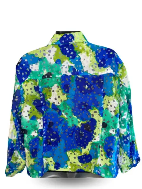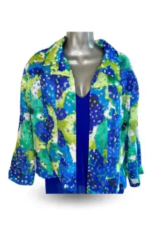 Chaqueta curvy de lino y rayón con trasparencia de la marca neoyorquina Ruby RD, diseño acuarela, talla 14.Delicada prenda de lino con trasparencias que la hacen elegante y estructurada.La app me lo marca como blazer pero en realidad es una chaqueta de cóctel fresca y elegante.