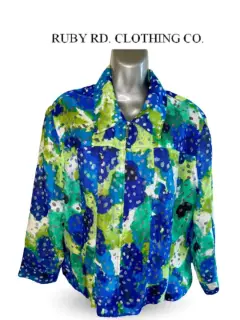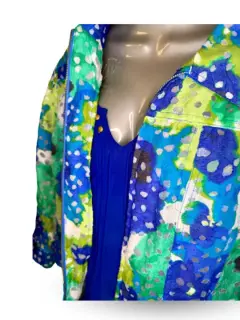 Chaqueta curvy de lino con trasparencia. Chaqueta curvy de lino y rayón con trasparencia de la marca neoyorquina Ruby RD, diseño acuarela, talla 14.Delicada prenda de lino con trasparencias que la hacen elegante y estructurada.La app me lo marca como blazer pero en realidad es una chaqueta de cóctel fresca y elegante.