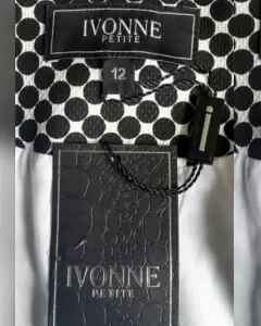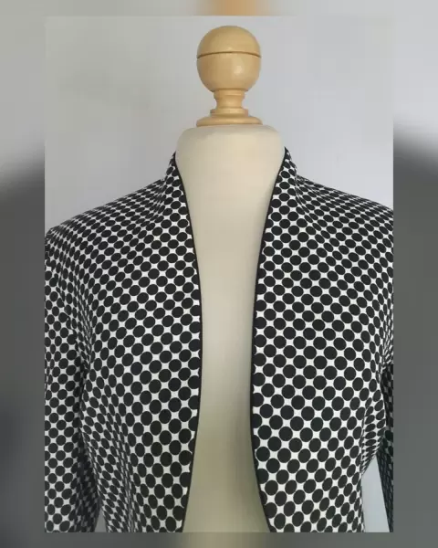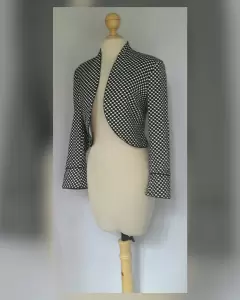 Chaqueta estilo Spencer c/estampado polka dots en base color blanco y circulos negros, cuello pico, sin sistema de cierre, manga larga terminada en campana y forro interior. Talla 12. Dimensiones: 40.5 cms hombro a hombro, 53 cms axila a axila, 50.5 cms zona baja, 46 cms largo, 57.5 cms manga. 64% poliéster, 33% poliamida, 3% elastano. Para lavado en seco.