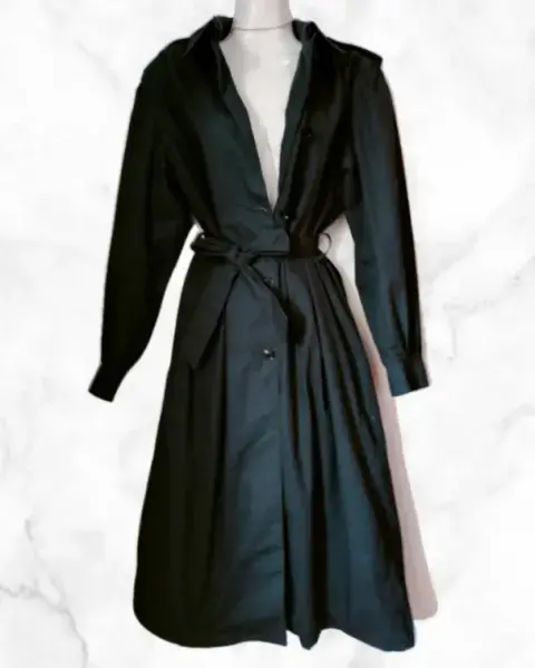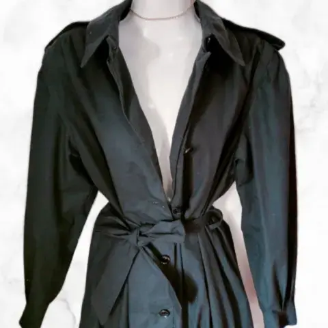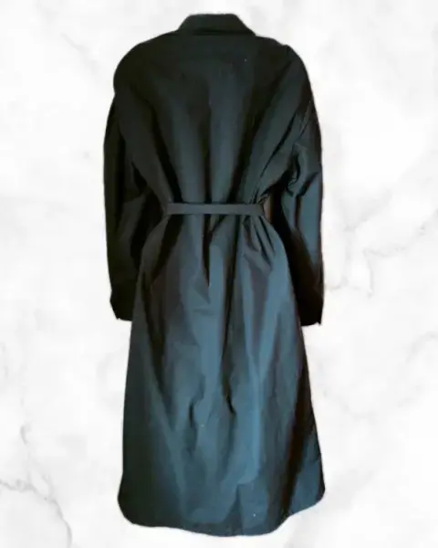 Gabardina Negra. Talla MEl color esta en perfecto estado.Tiene sus cintas para amarrar.60 cm Axila a axila60 cm largo de manga115 cm de largo