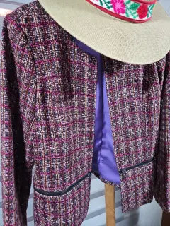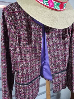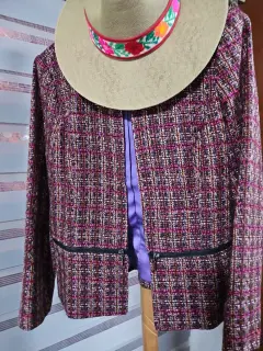 Saco jasoeado en tonos fiusha, café, negro. Forro intacto. Manga larga clásica. Detalles de cierres a los lados resalte de corte acentuado en cintura
