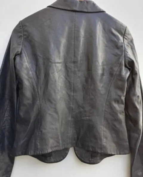 Lindo blazer de piel muy suave , corte entallado que marca la cintura, color ligeramente grisáceo, esta marcado como talla 38 pero queda perfecto a xs