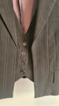 Lindo blazer de color café rayado con chaleco integrado, para un atuendo formal, el único detalle es que la etiqueta se descosio un poco ya no la cosi de nuevo para no maltratar el forro, el foto está integro. Medidas hombro a hombro 38cm, axila a axila 43, largo del cuello a la base 50cm, hombro a la muñeca 59cm
