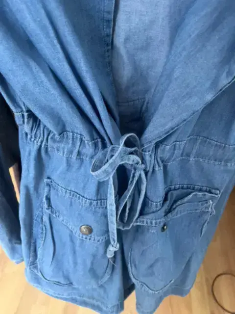 Parka mezclilla ligera cklass con resorte en la cintura y cinto , dos bolsas y gorro . Es mezclilla delgada sirve más como ensamble está preciosa . Podría quedar a talla M