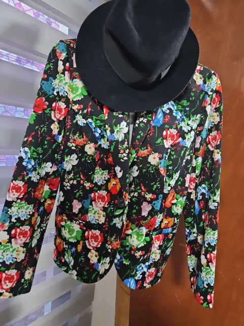 Perturbable elegancia. Saco metropolí, estampado floreado en espasmos de rojo y azul. Un solo botón. Talla 11