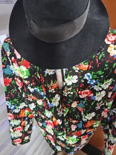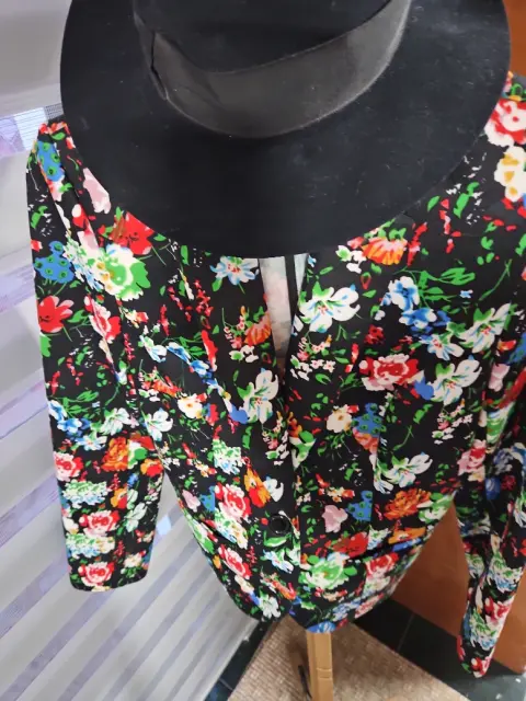 Saco metropolí, estampado floreado en espasmos de rojo y azul. Un solo botón. Talla 11