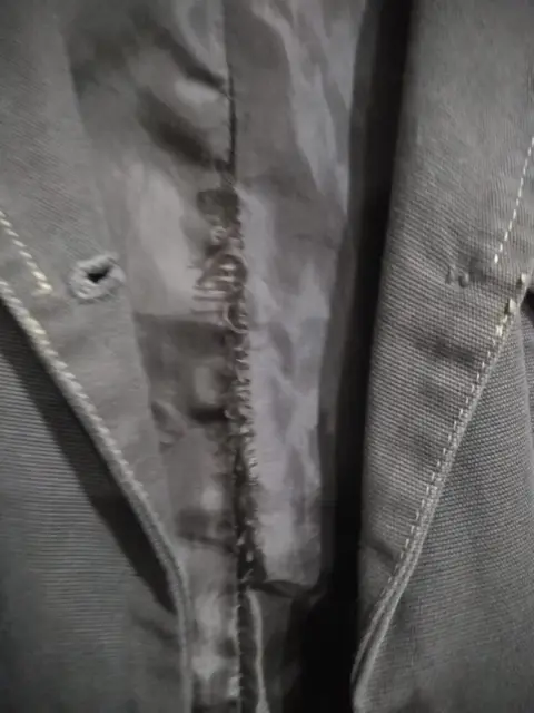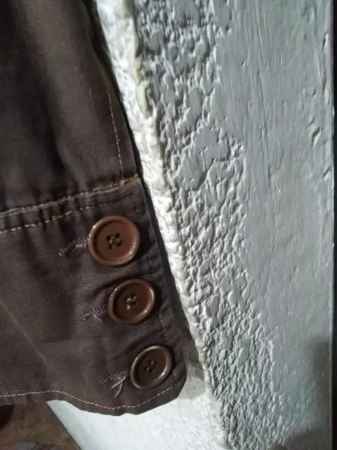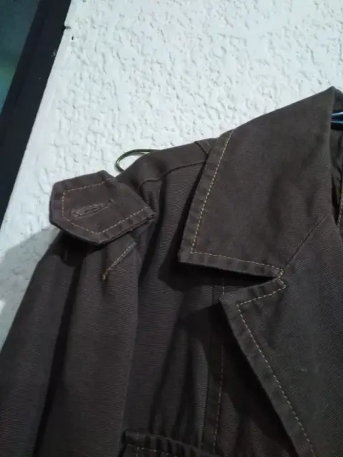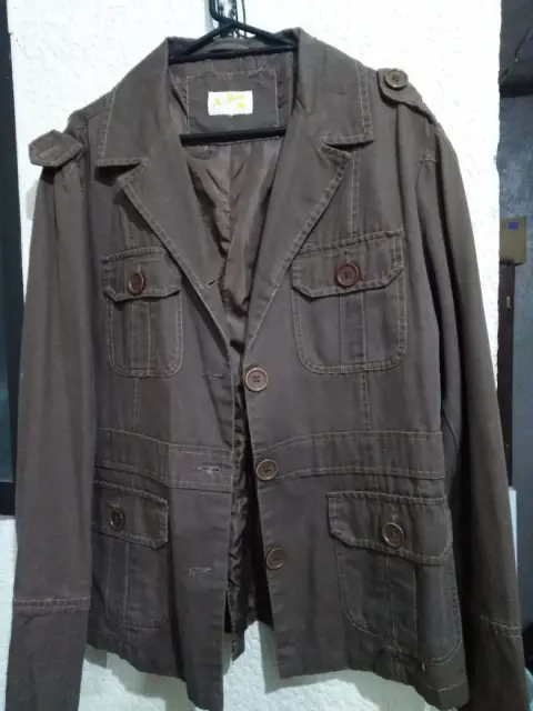Saco 3/4 composición mezclilla/algodón color café talla G, le falta un botón en la hebilla del hombro y en el forro de la espalda esta descosido, se muestra en fotos, en buen estado.