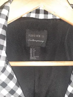 Saco abajo de la cadera. Marca forever 21, Talla S, bolsas laterales, forro negro, el largo es hasta la cadera baja. Material es 78% rayón, 19% nylon/polyamide y 3% spandex/ elastane.